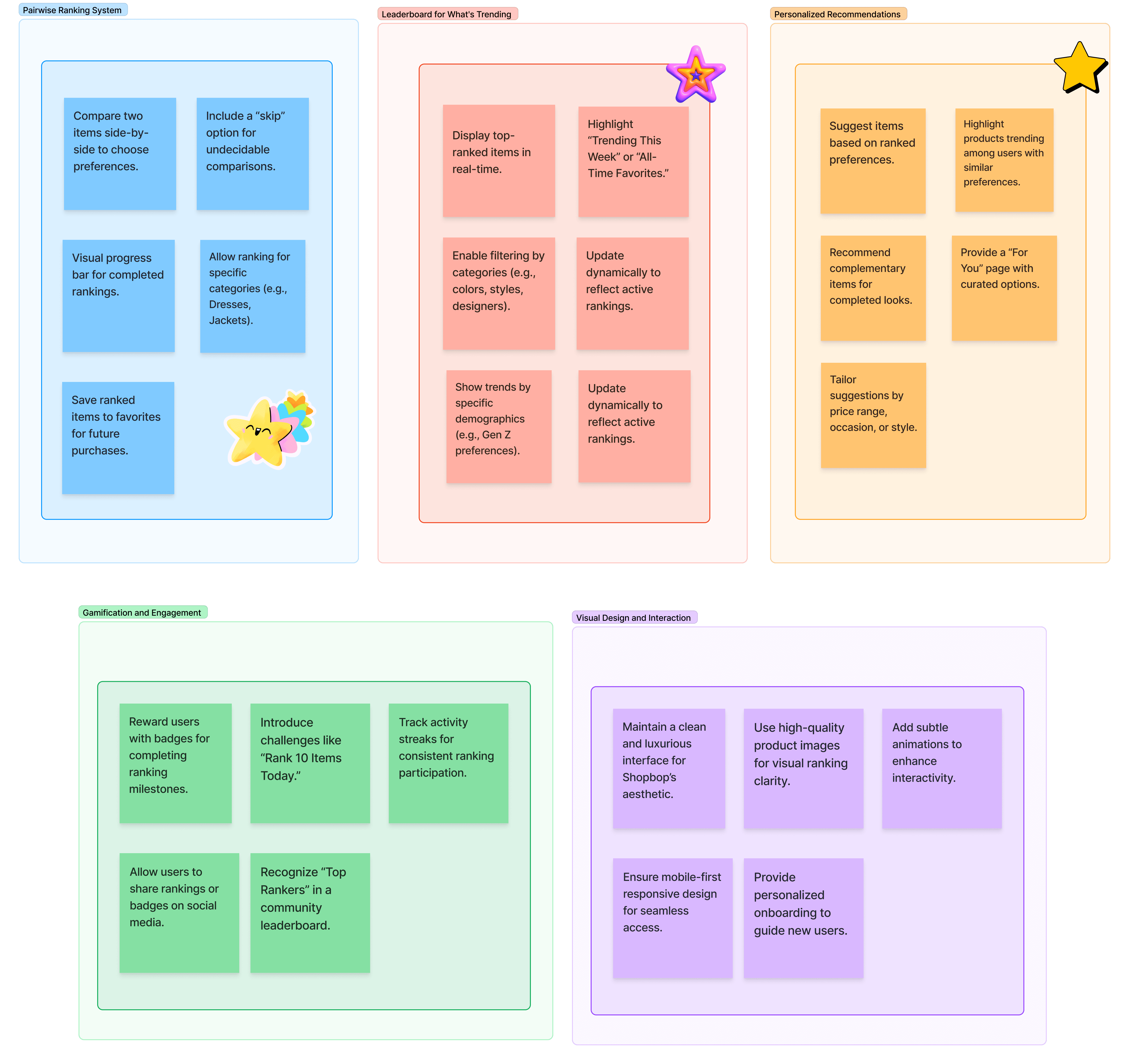 Through a detailed analysis of brainstormed ideas across themes like pairwise ranking, trending leaderboards, and personalized recommendations, I identified three core insights that could enhance user engagement and create an interactive shopping experience. These insights focus on decision-making through comparison, social validation of trends, and tailored shopping experiences.
