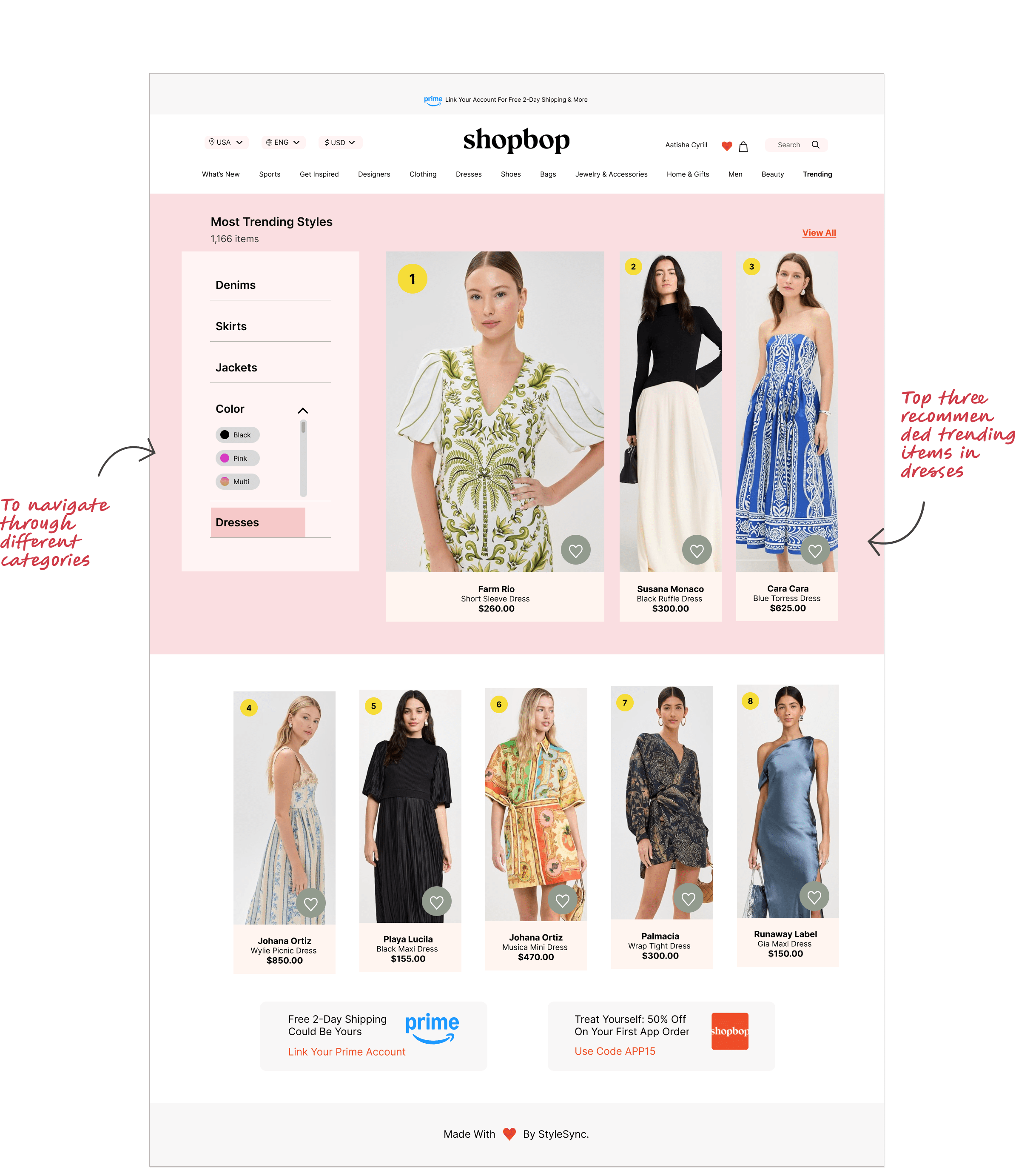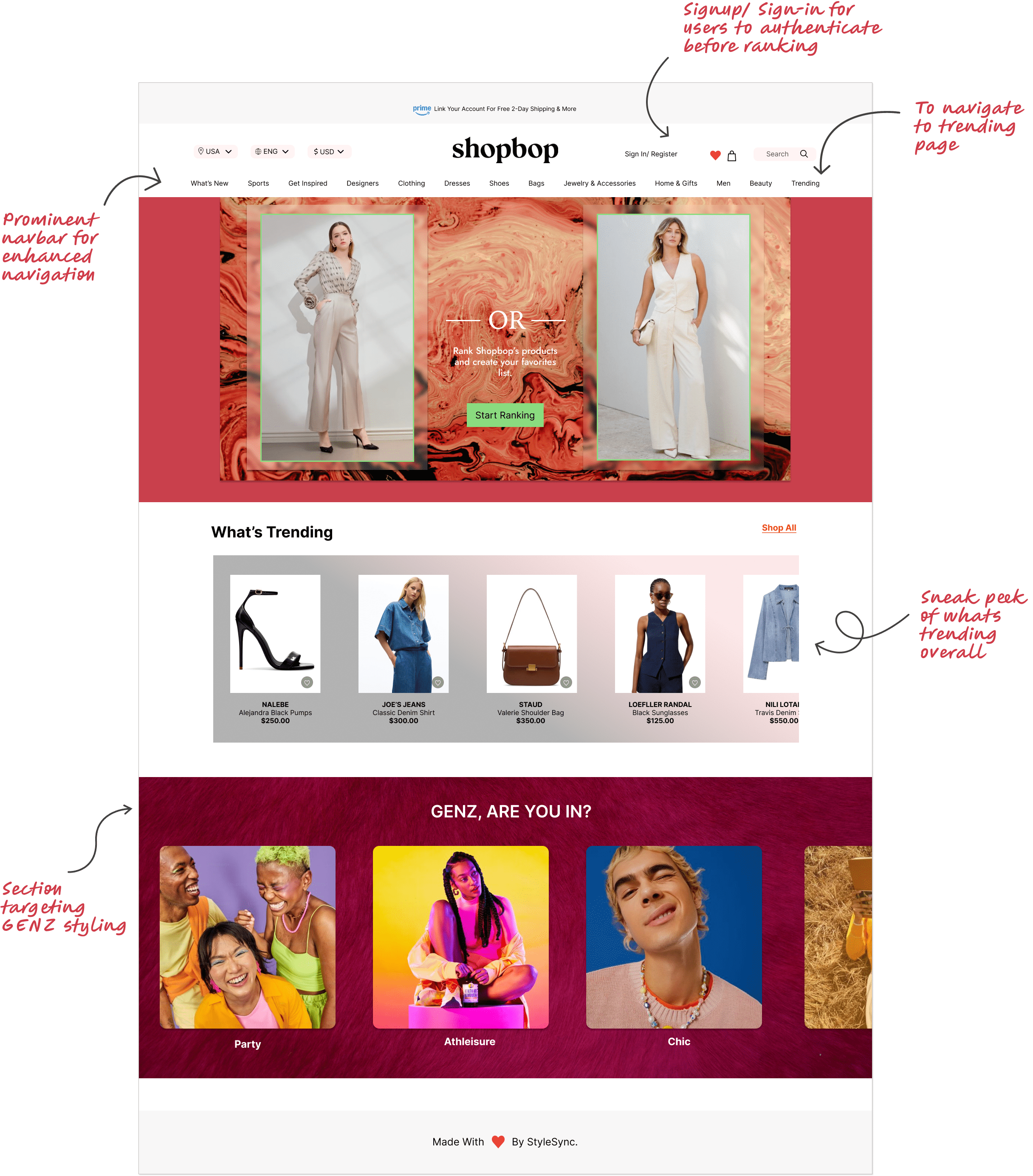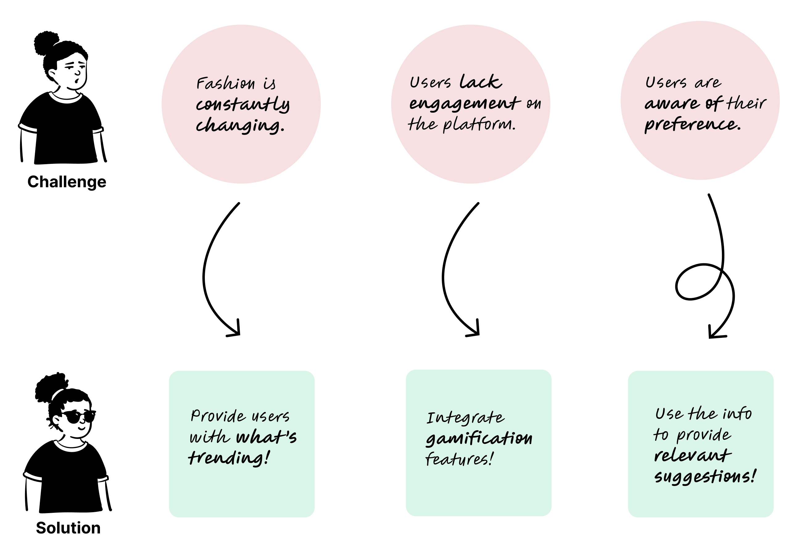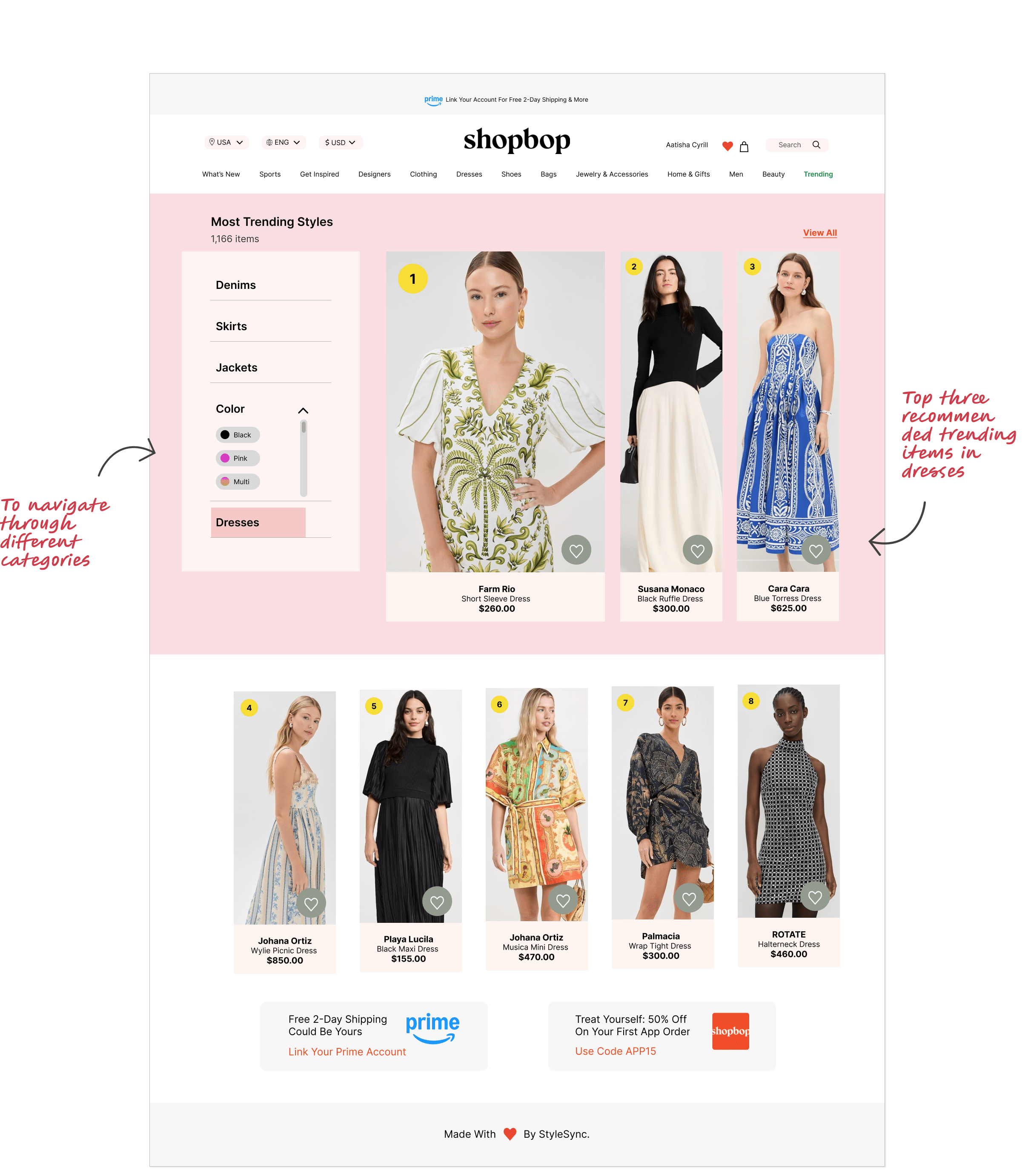 By analyzing user interviews, competitor research, affinity mapping, and pinpointing user challenges, I identified three critical areas where online shoppers often struggle: keeping up with fashion trends, finding products that align with their style, and feeling overwhelmed by too many choices. To address these challenges, I established three key design goals for the Shopbop platform: