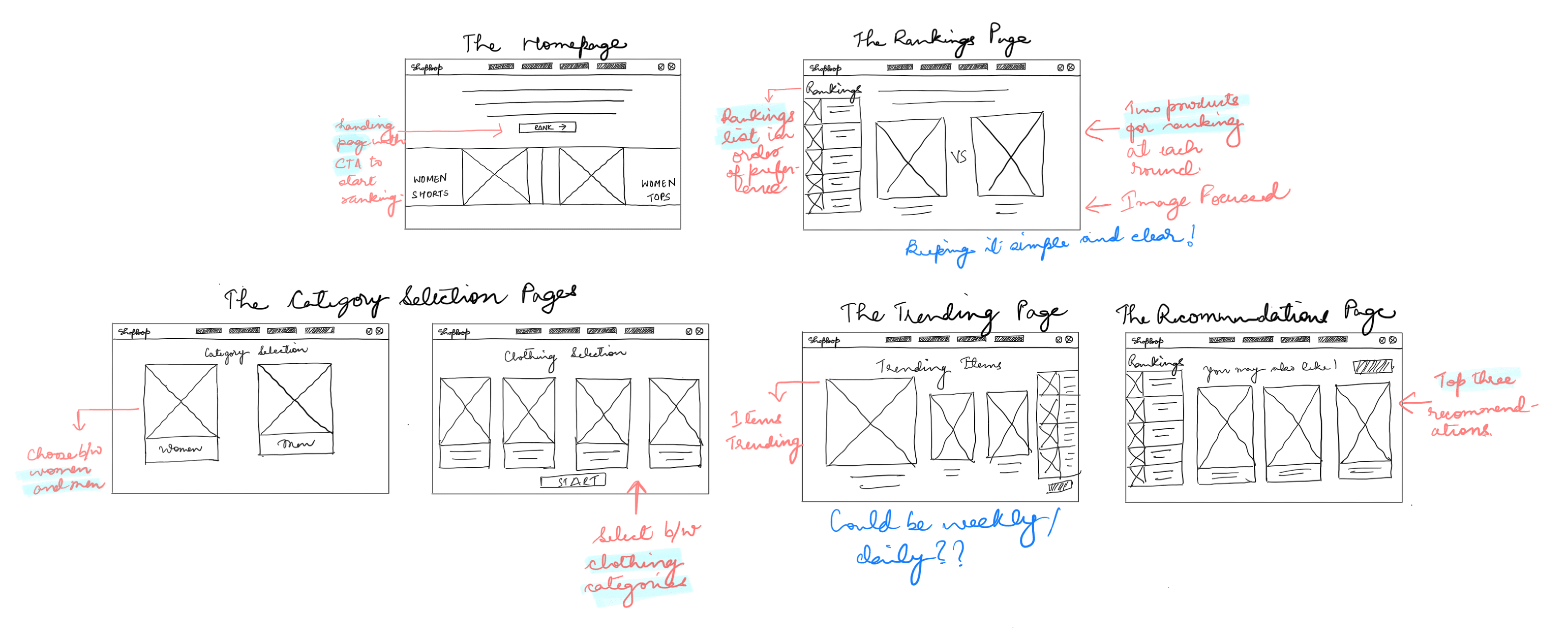 With the workflow in place, I initially did some research on Shopbop's website and their design system. This helped me conceptualize the flow through some initial screen designs. I drew the main screens related to ranking, checking trending items and recommended products.