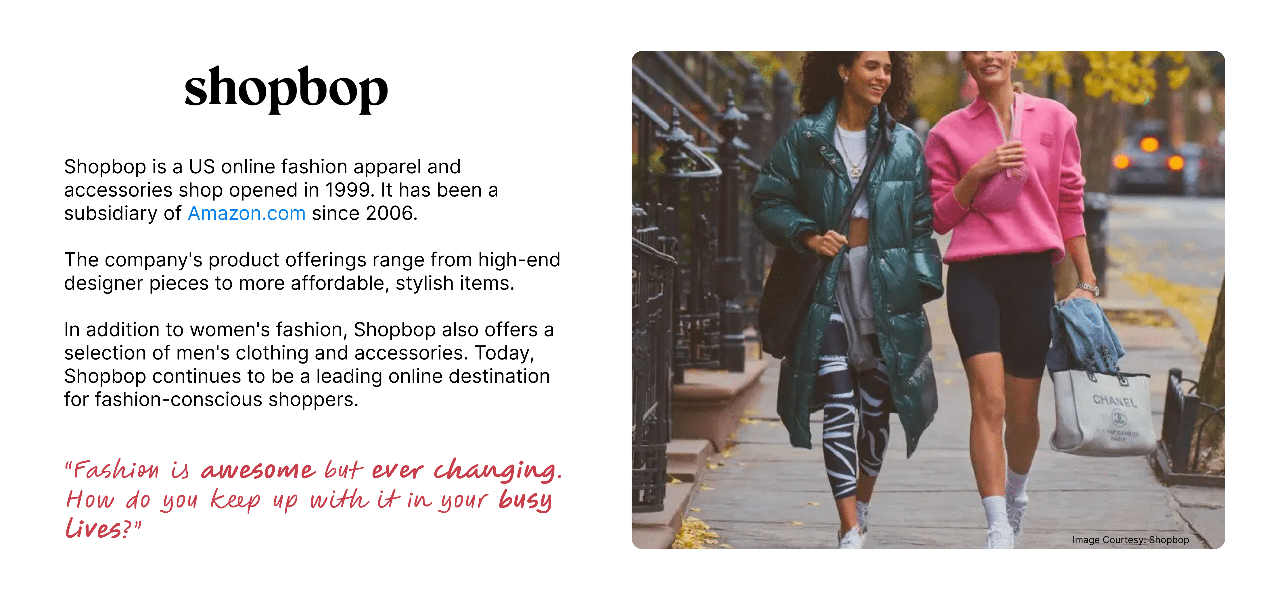 Enhance Shopbop's (US online fashion and accessories shop) social and interactive shopping experience by creating an engaging platform to make fashion discovery easier for all users.