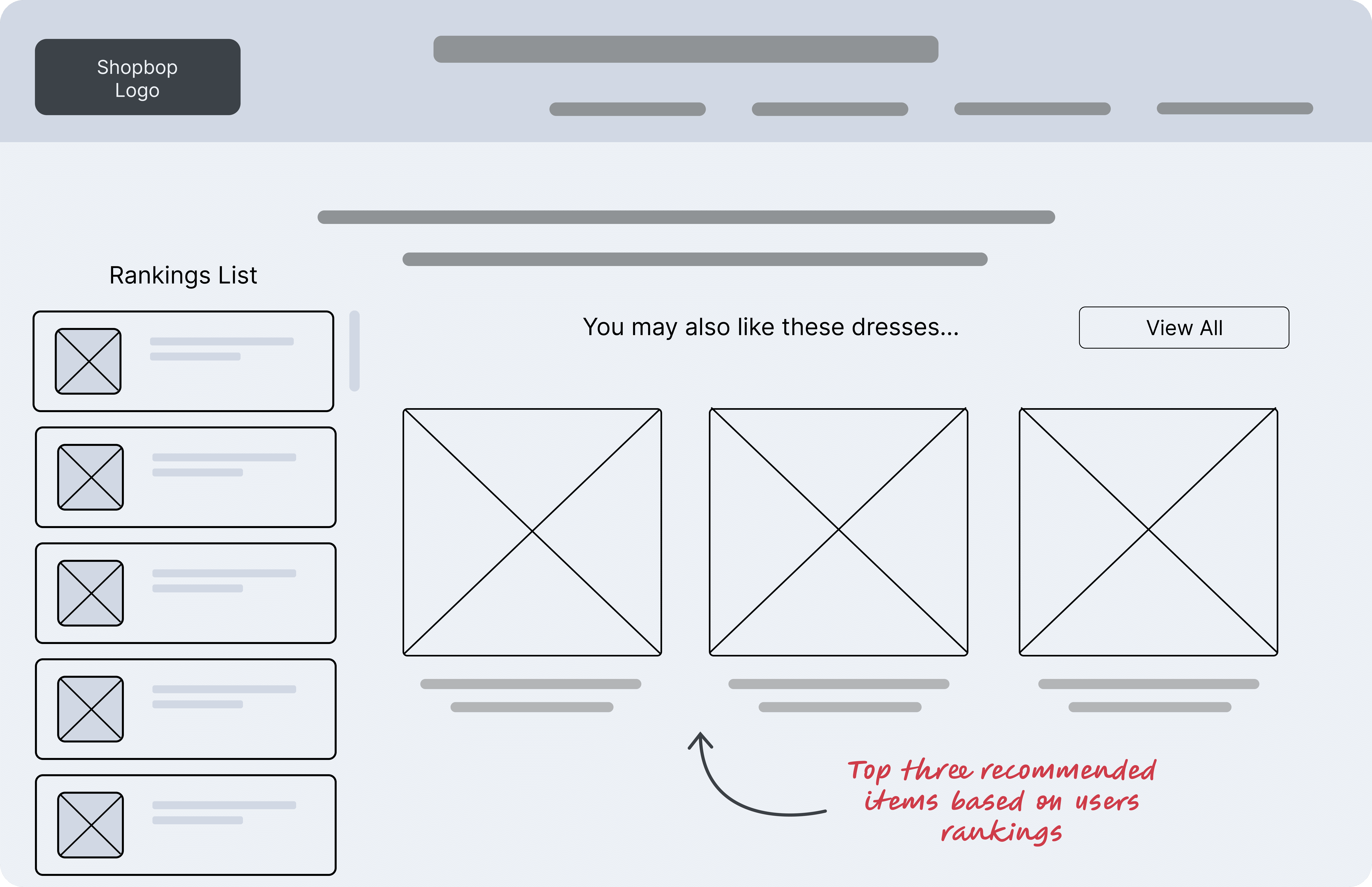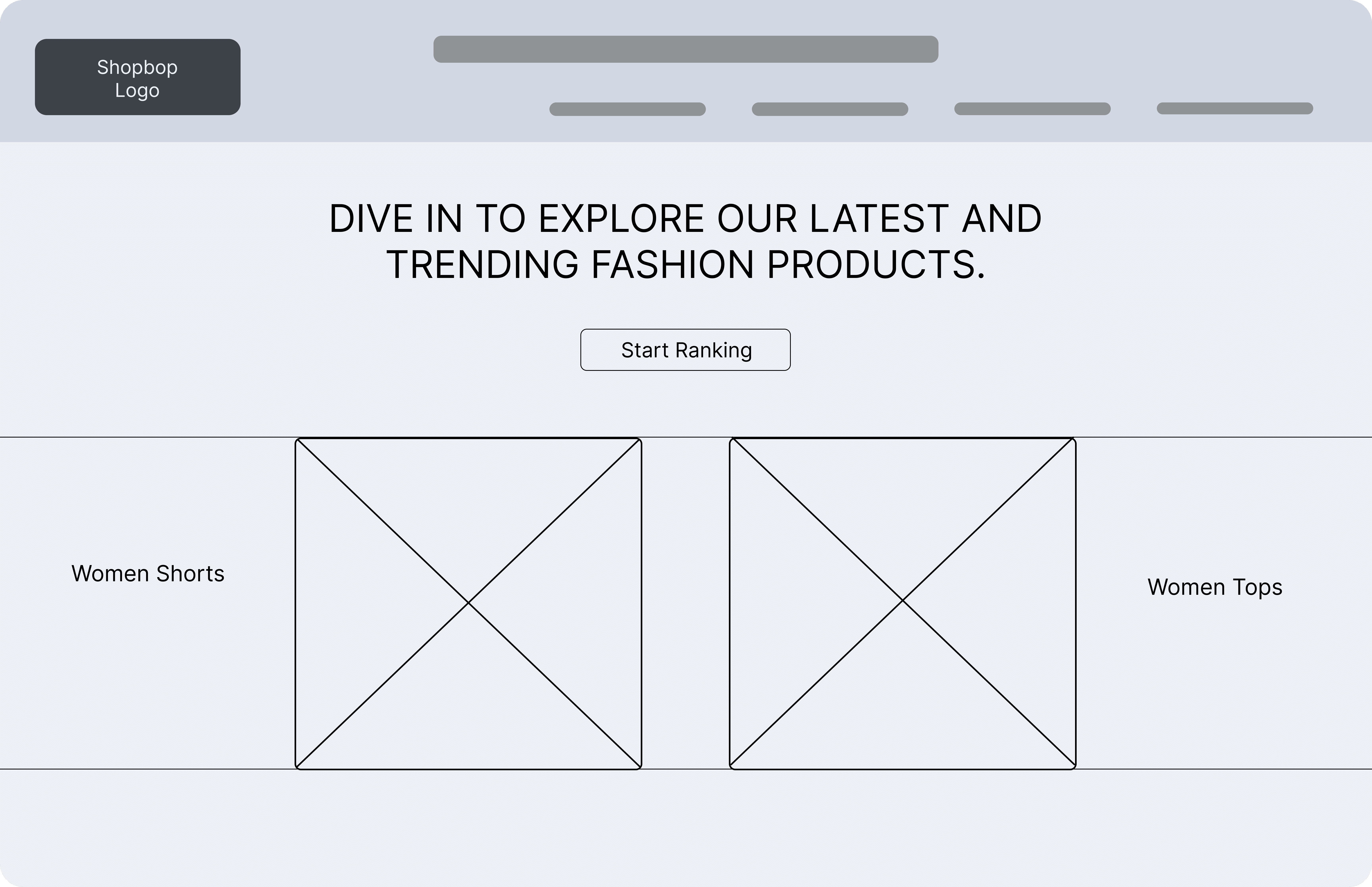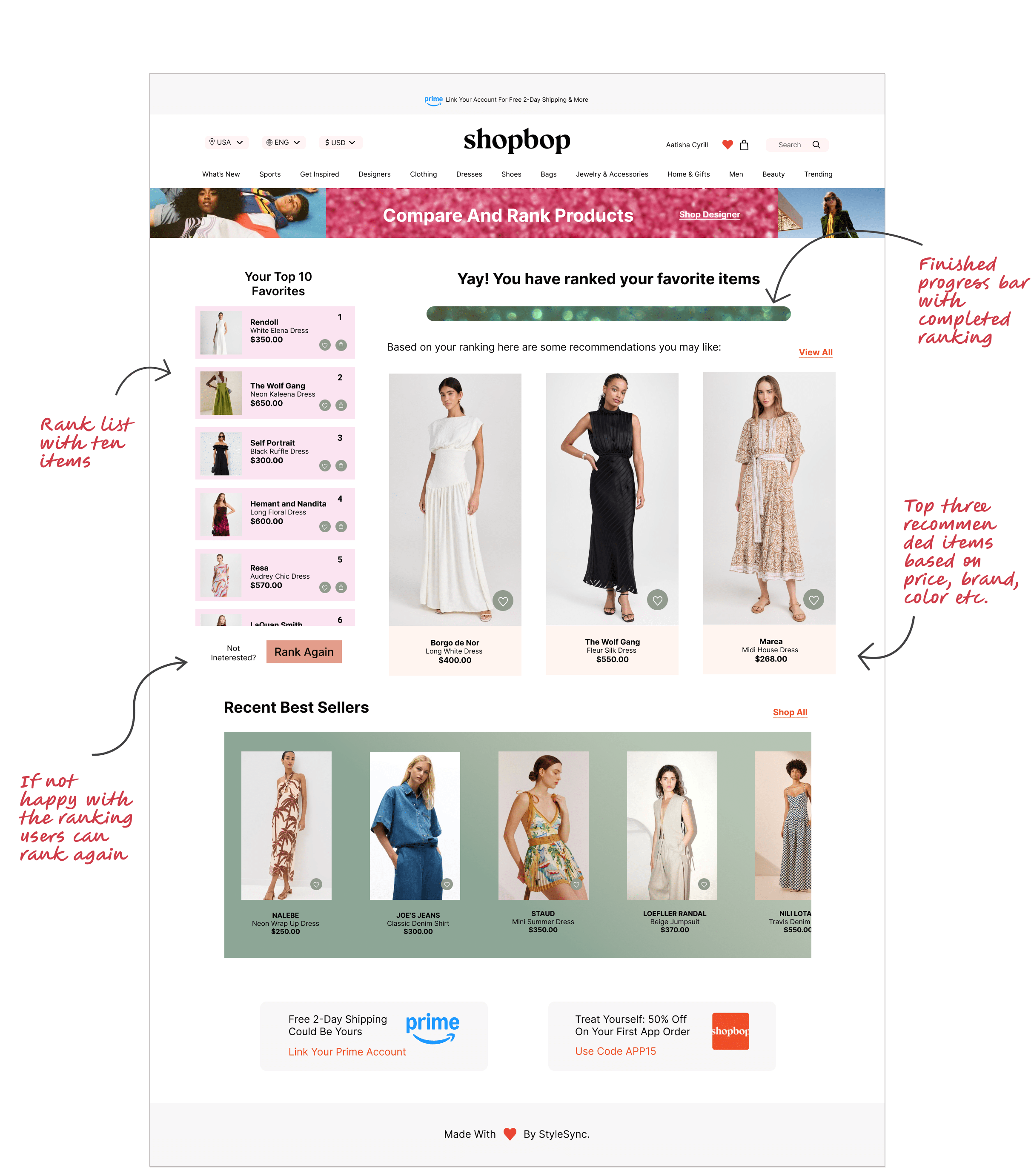 I created the final screens for all the workflows including ranking, showing recommendations and generating the leaderboards. The mid-fidelity prototypes were tested with users and the feedback received were incorporated for better functionality and visual design. These included introducing ranking instructions, progress bar and showing item images zoomed. The color palette used was provided by Shopbop.