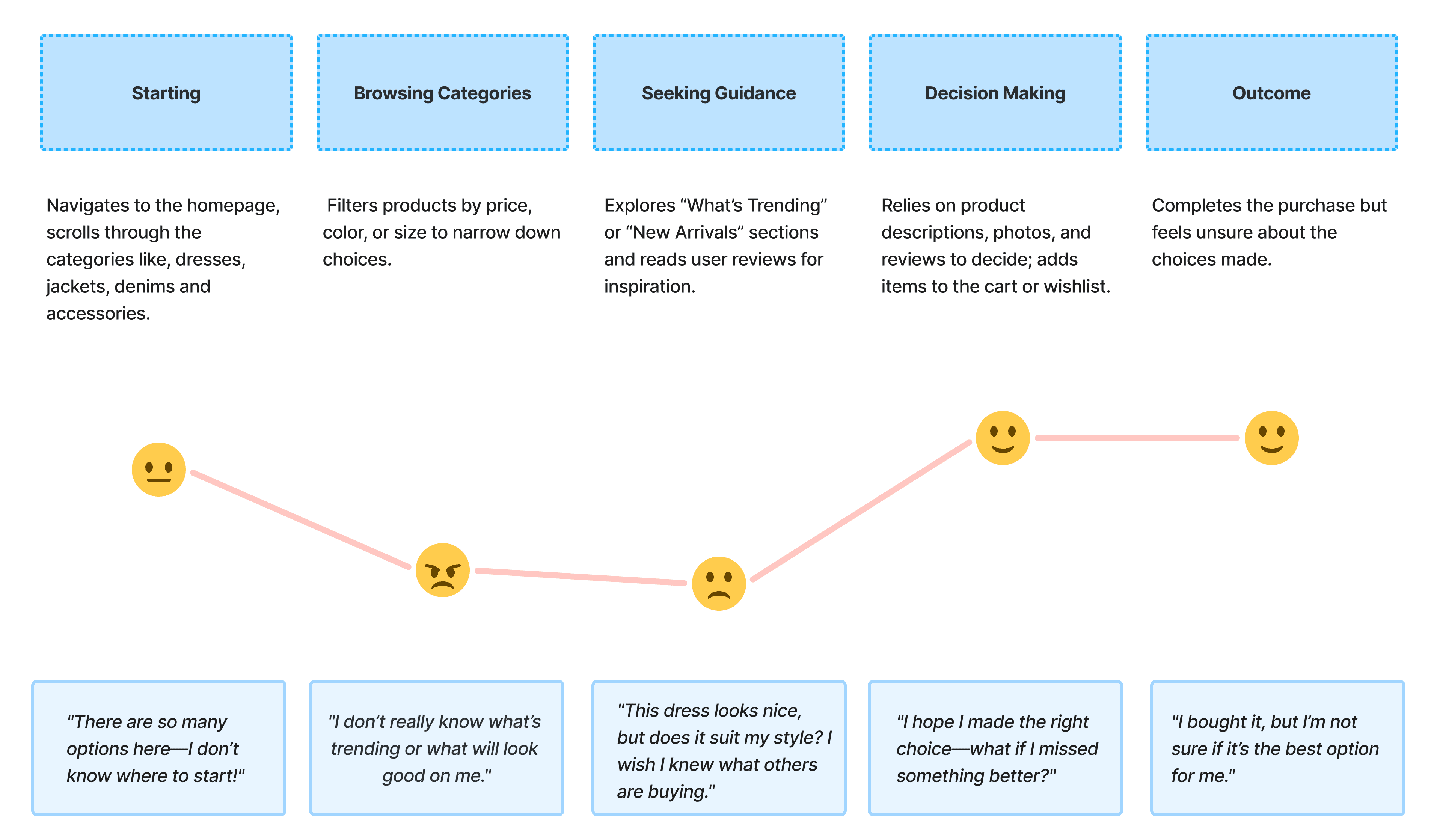I created a user journey to map out how Natasha, a potential user for our platform would navigate normally while shopping online. This journey highlights the challenges faced by users like her who love fashion but also seek a more guided, interactive, and confidence-boosting shopping experience.