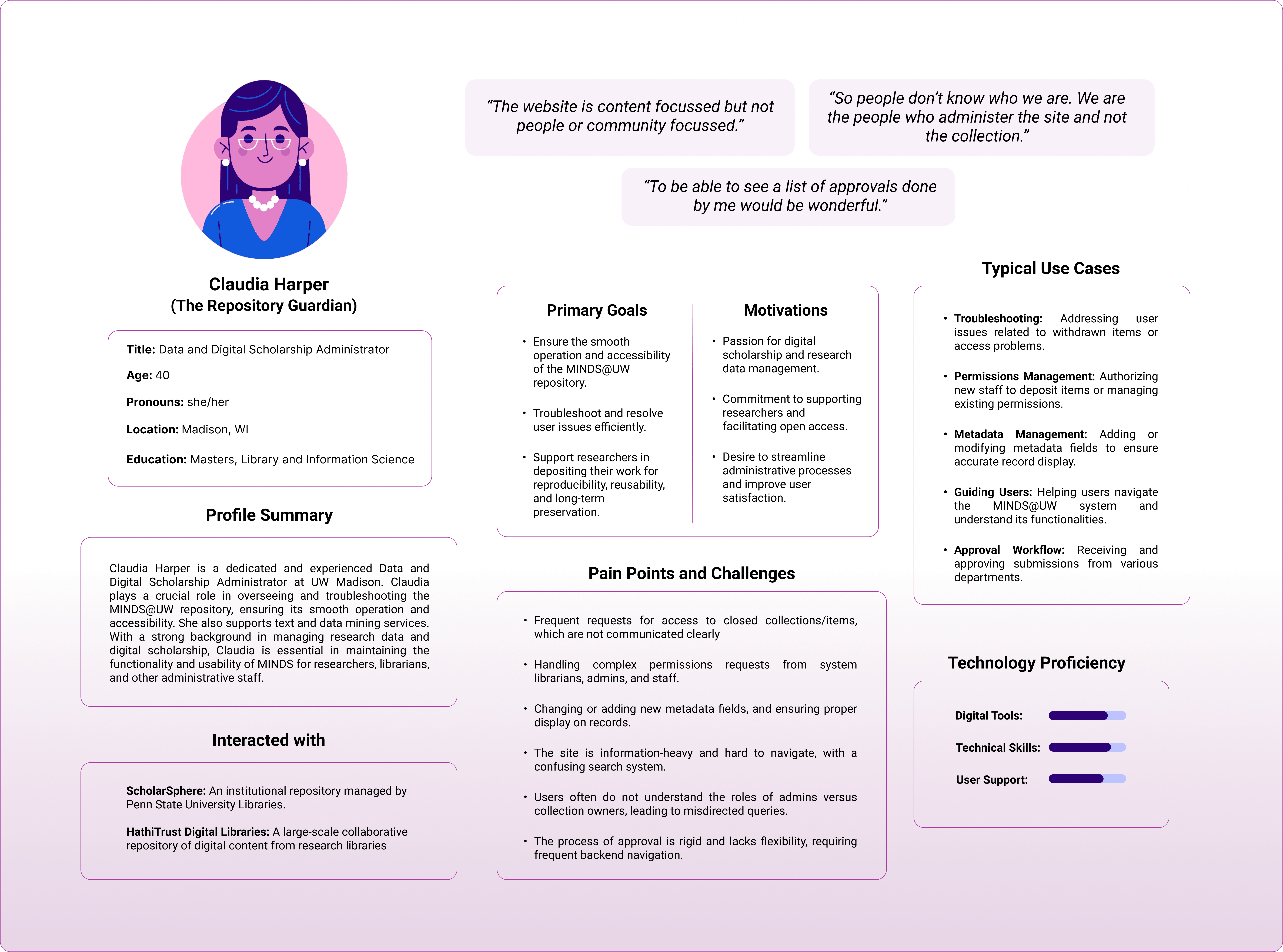 I created two personas to represent two different categories of users: admins and depositors (researcher, faculty, staff etc). By segmenting these personas, I was able to understand their unique motivations, pain points, and interaction patterns, ensuring that design improvements address the specific need of both backend administrators and content contributors/searchers effectively.