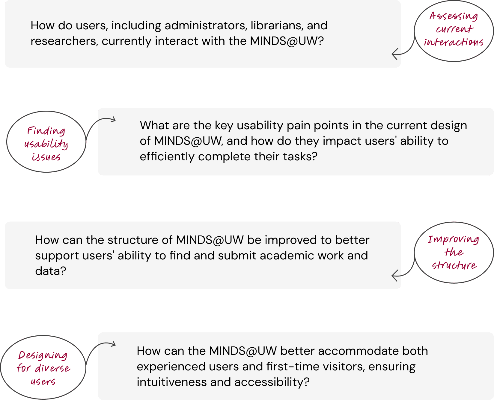I needed to understand who MINDS was really serving. There were three very different groups with competing priorities: Admins, the super-users; UW-Madison Users, the primary contributors; and UW System Users, an overlooked group from outside Madison. Mapping these groups early revealed tensions between administration and contribution, shaping who I needed to talk to next.
