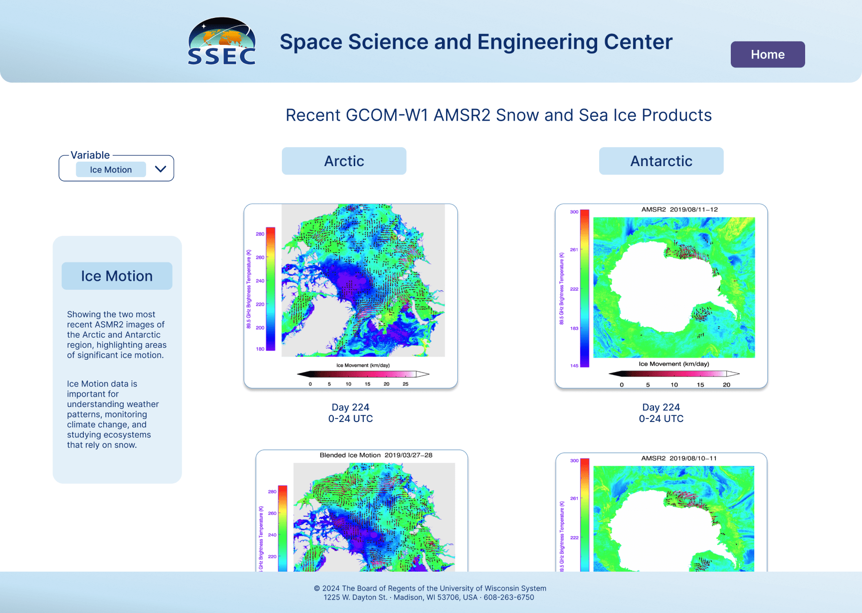 The SSEC scientists collect extensive data on snow, ice, and polar winds from various satellites and instruments in the Arctic and Antarctic regions. This data is curated and presented as images that can be generated on a daily, weekly, or monthly basis which are then closely monitored to study climate patterns. However, the current mechanism stores the images in folders and hence lacks effective navigation and flexibility for accommodating future products needed to allow for the efficient study of both recent and historical climate data and be flexible enough to accommodate future products.