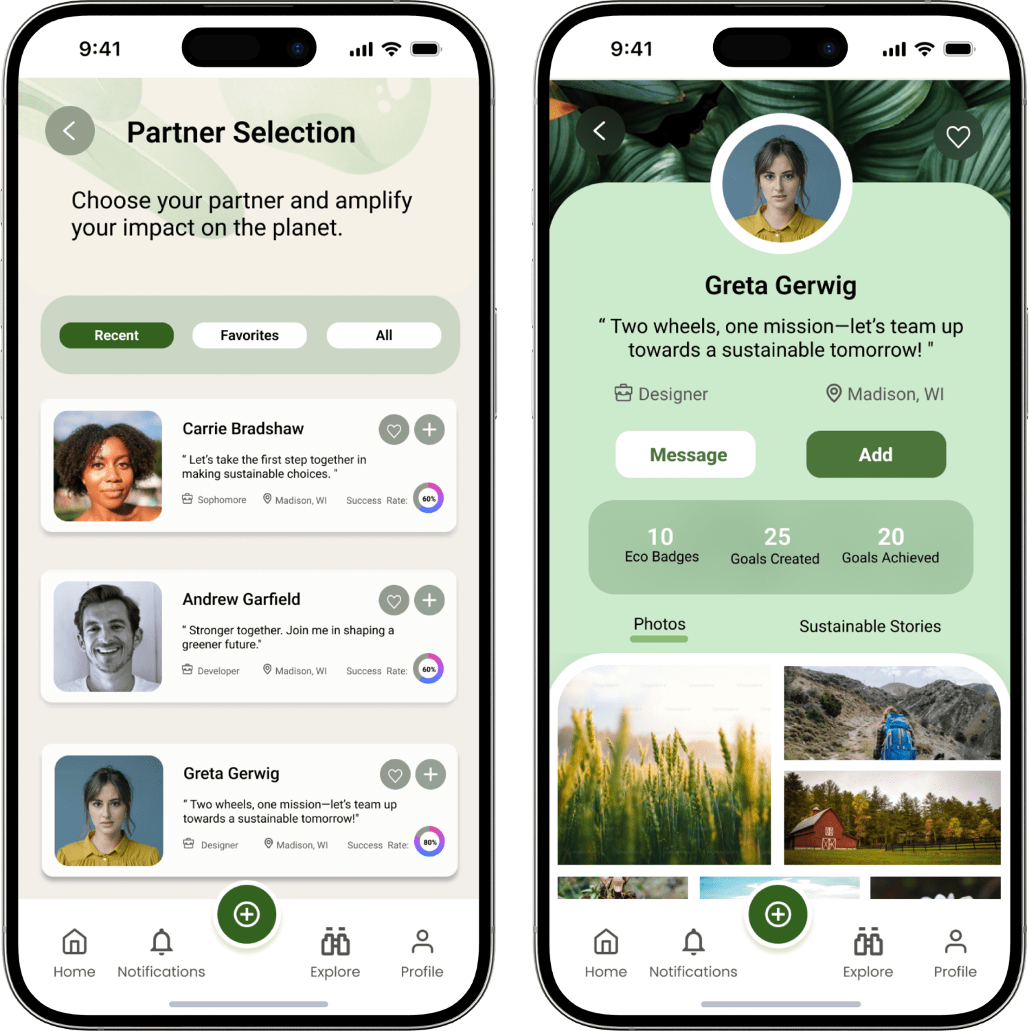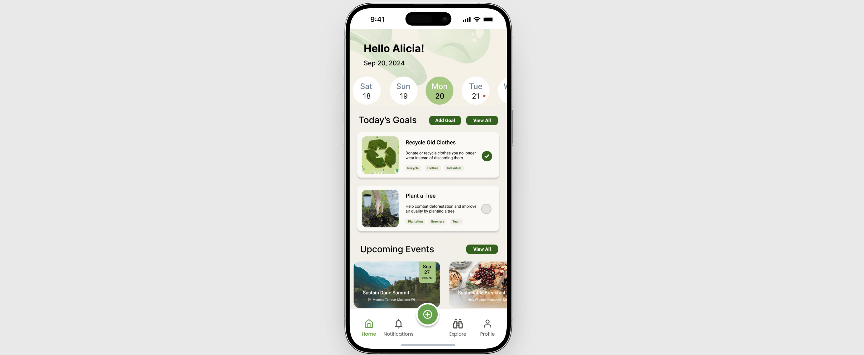 To promote a sustainable lifestyle, this app design makes sustainable choices engaging, social, and rewarding. By integrating education, goal-setting, and a recognition system, users are supported at each stage of their sustainability journey.