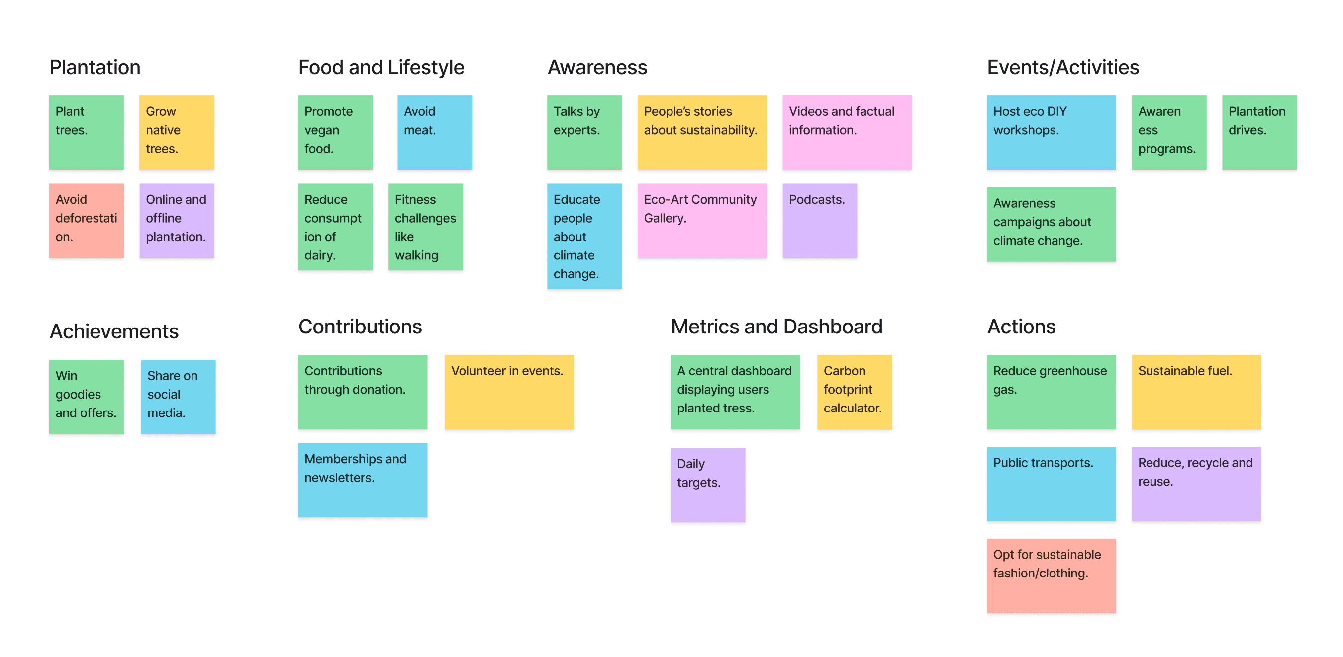 Through a detailed analysis of brainstormed ideas across themes like plantation, food and lifestyle, achievements, and metrics, I identified three core insights that could enhance user engagement in everyday environmental actions. These insights focus on collaboration, awareness and a sense of accomplishment.