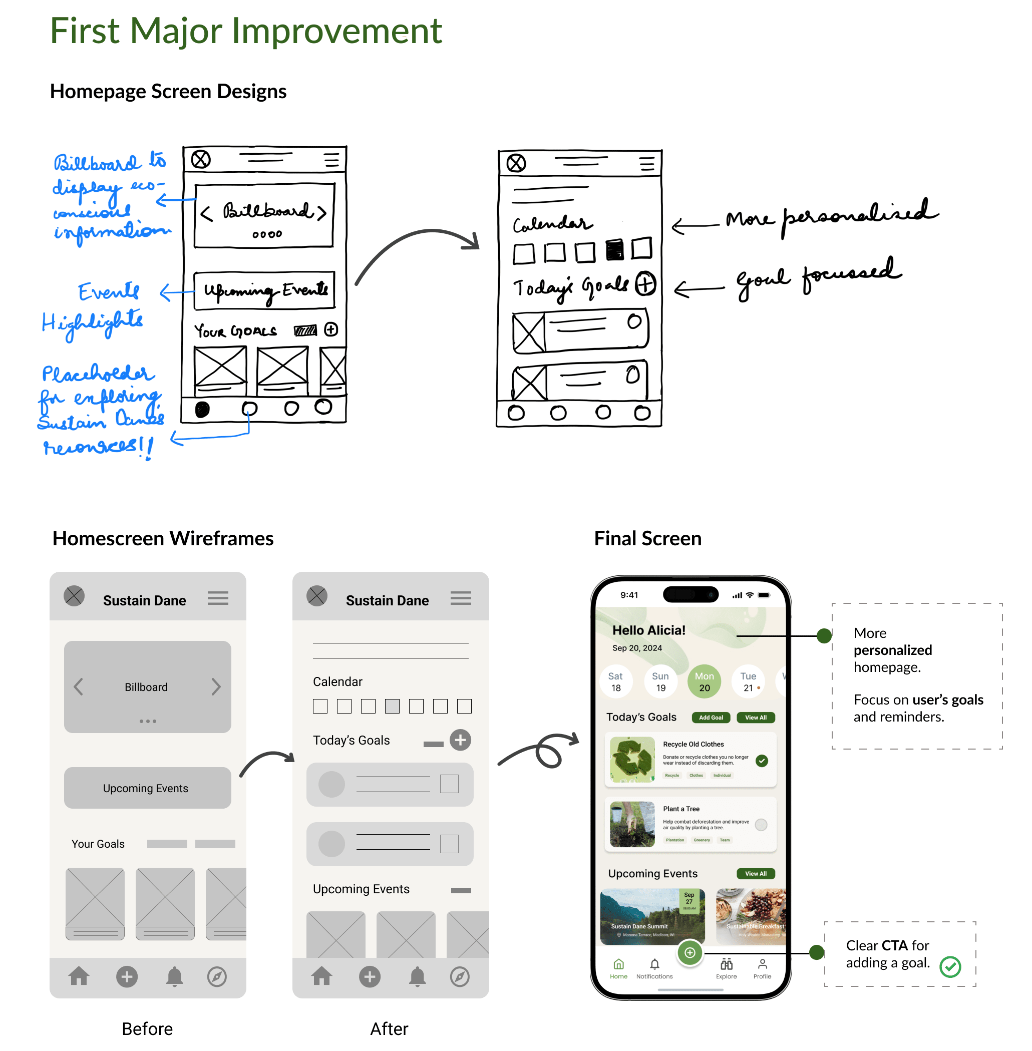 - Participants felt the need of a more personalized homescreen where they could easily access their goals.