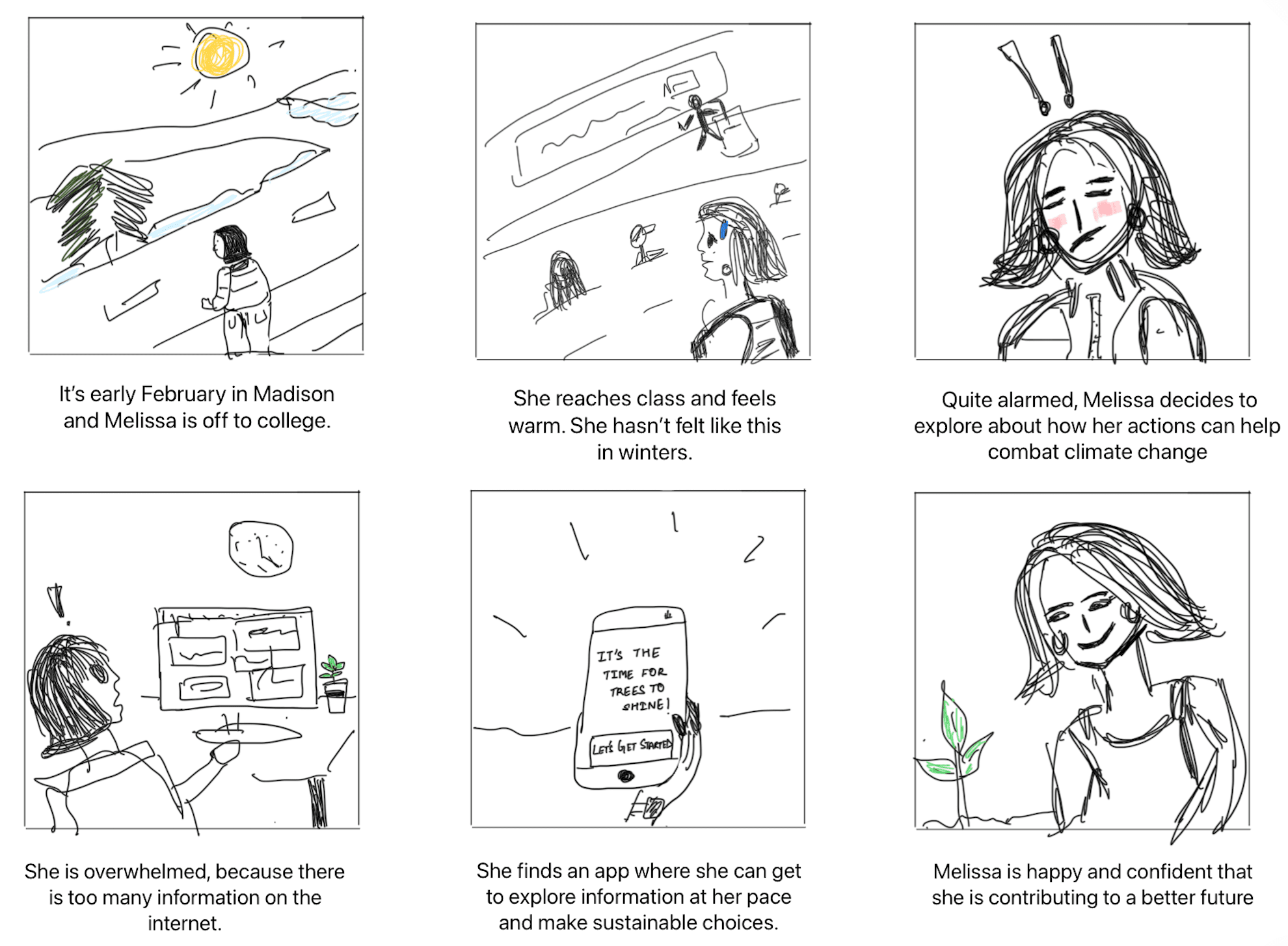 I sketched a storyboard to depict the problem inspired by a personal incident while living in Madison. This was when I experienced relatively higher temperatures in February which is usually not the case. This motivated me to contribute more towards the design solution I was trying to accomplish.