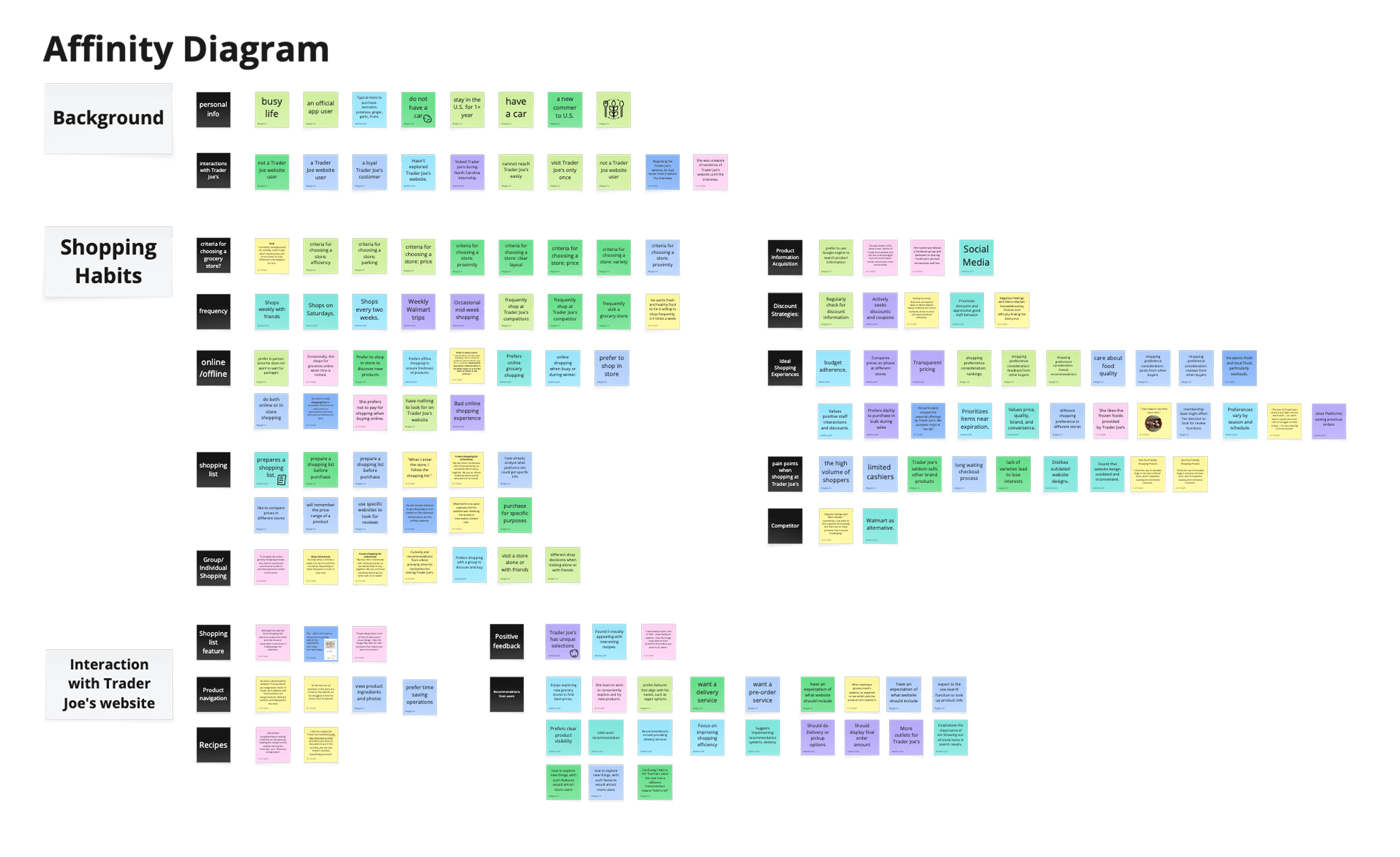 After interviewing participants and receiving survey responses, we brainstormed 140+ data points and came up with 3 themes around user demographics, shopping habits and interactions with Trader Joe's store and website.
