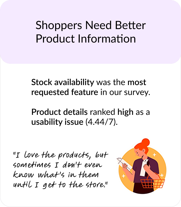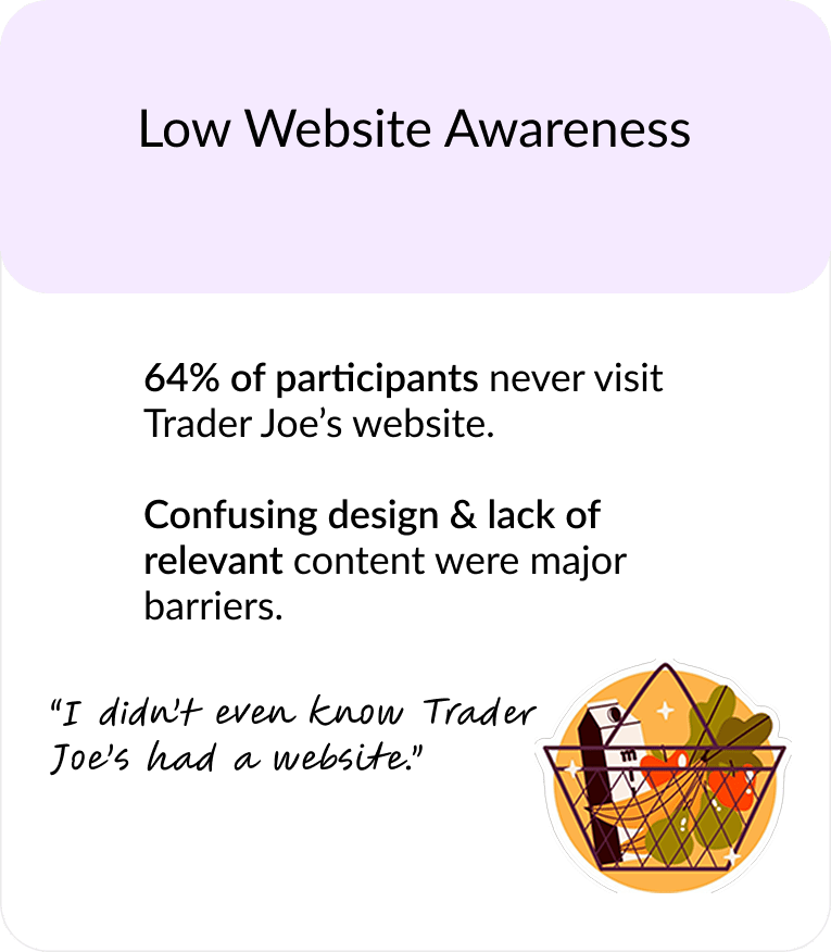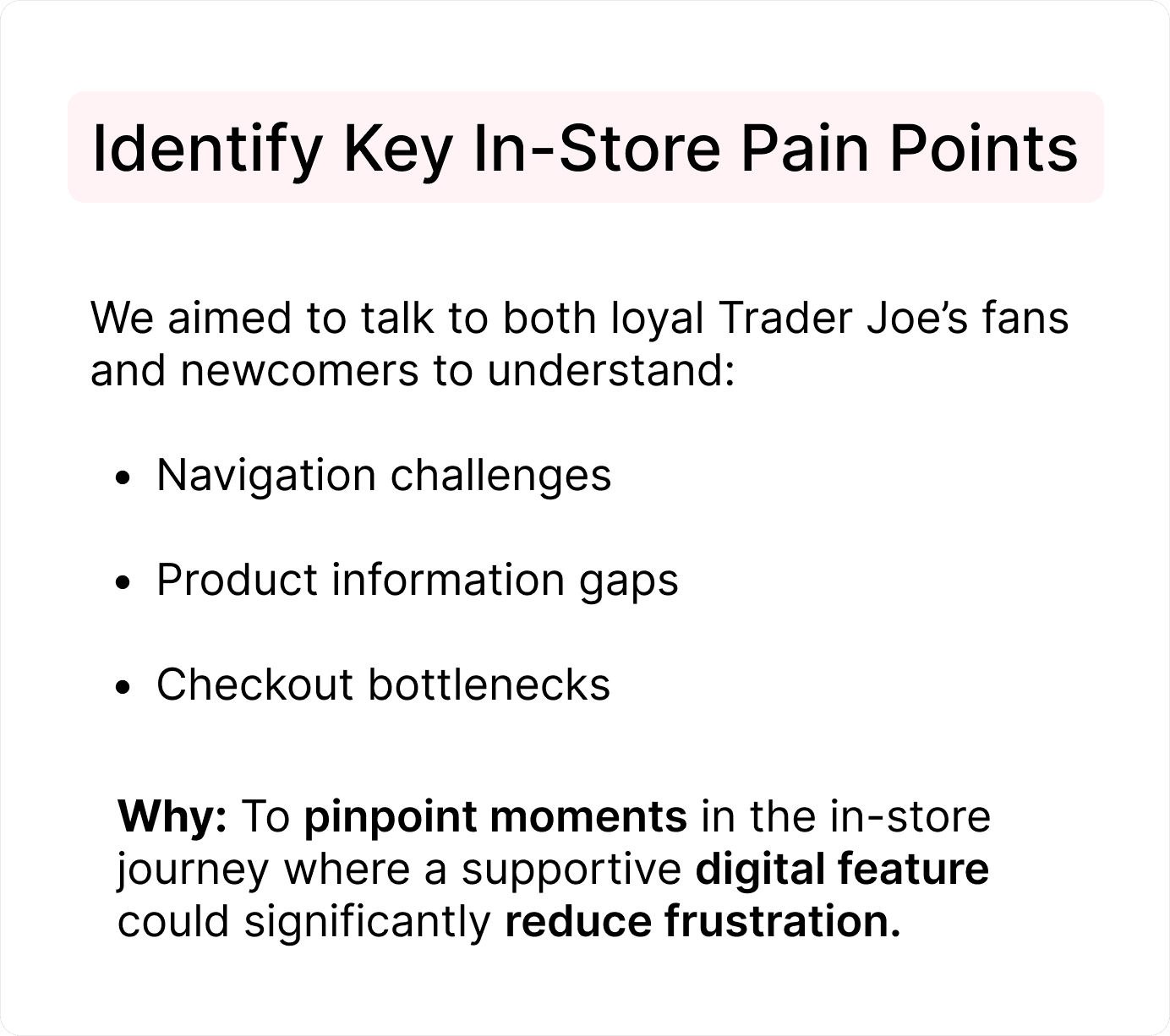 During our preliminary research, we noticed that customers often experience common pain points while shopping at Trader Joe's. While a sense of discovery is part of the brand's charm, we suspected that some challenges could be eased through carefully designed online solutions.