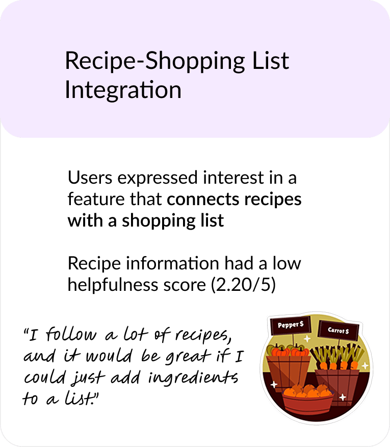 - Users struggled to connect recipes with products, with recipe helpfulness scoring only 2.20/5 in surveys.