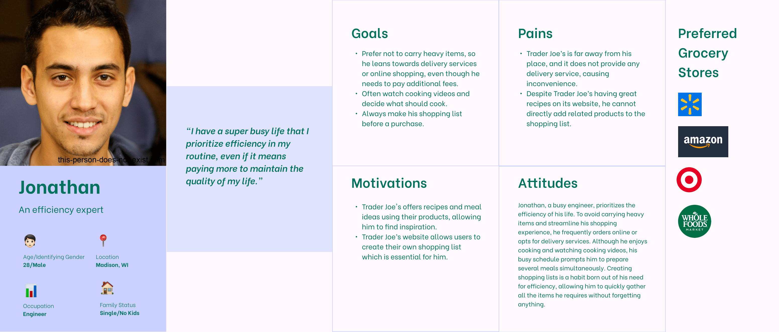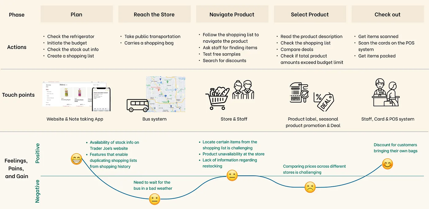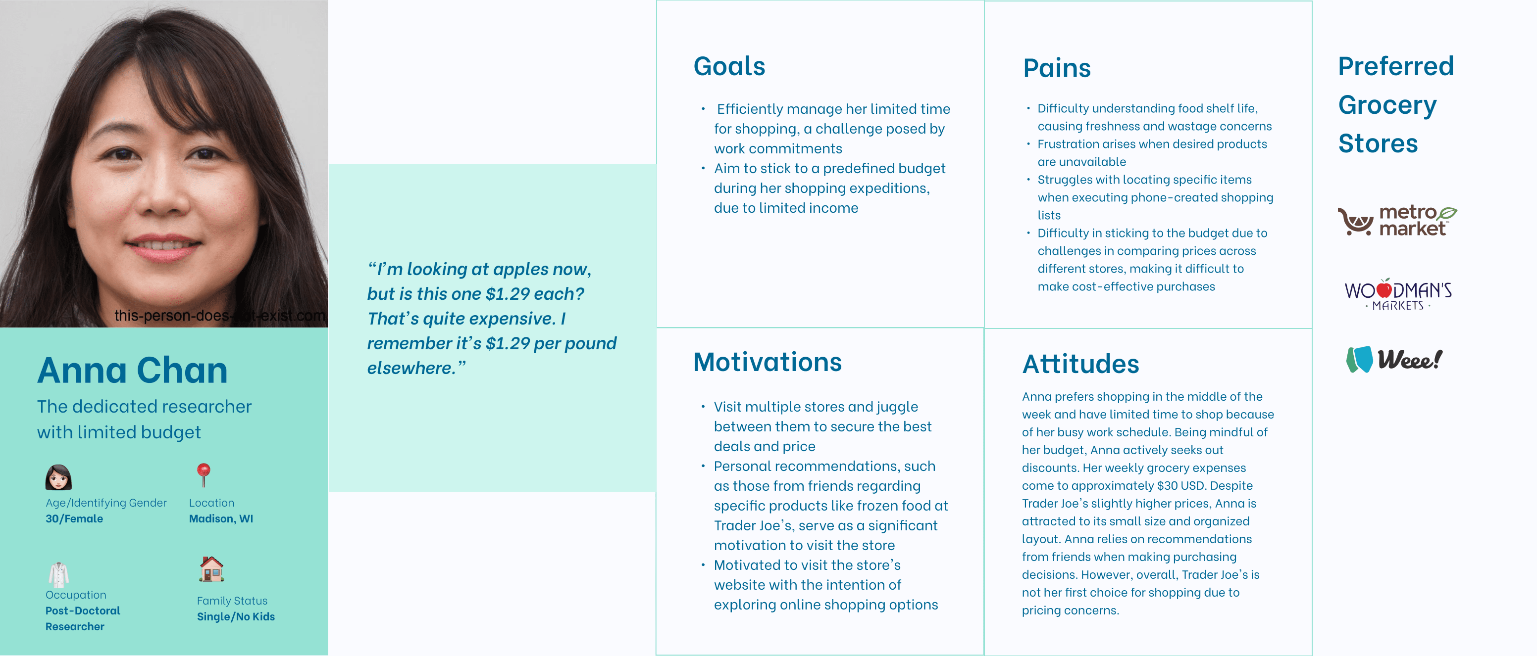 We created the user journey based on Anna Chan's persona, considering that the majority of research participants align with her characteristics (limited budget and doesn't prefer Trader Joe's website). We found out that the user faces the most challenge in reaching the store and through product navigation and selection.