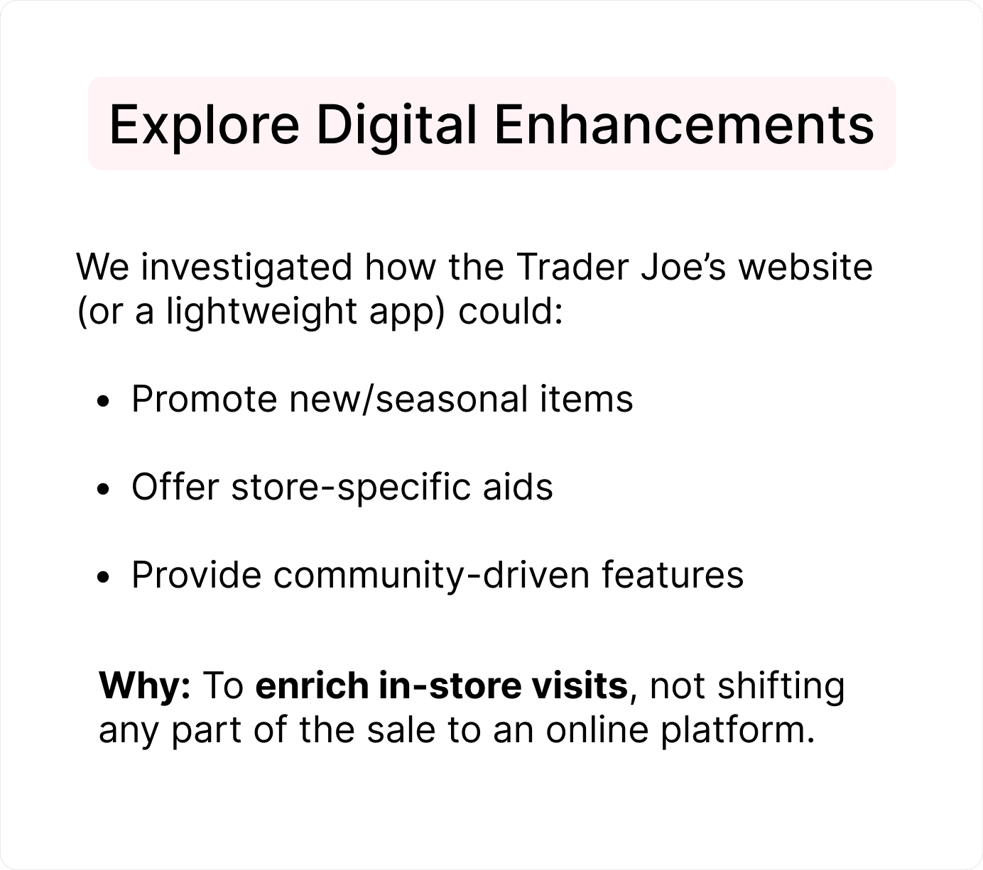 We translated our research findings and HMW statements into actionable design recommendations that enhance Trader Joe's in-store shopping experience while leveraging digital tools strategically. These recommendations maintain the brand's playful, discovery-driven shopping culture and do not introduce traditional e-commerce.
