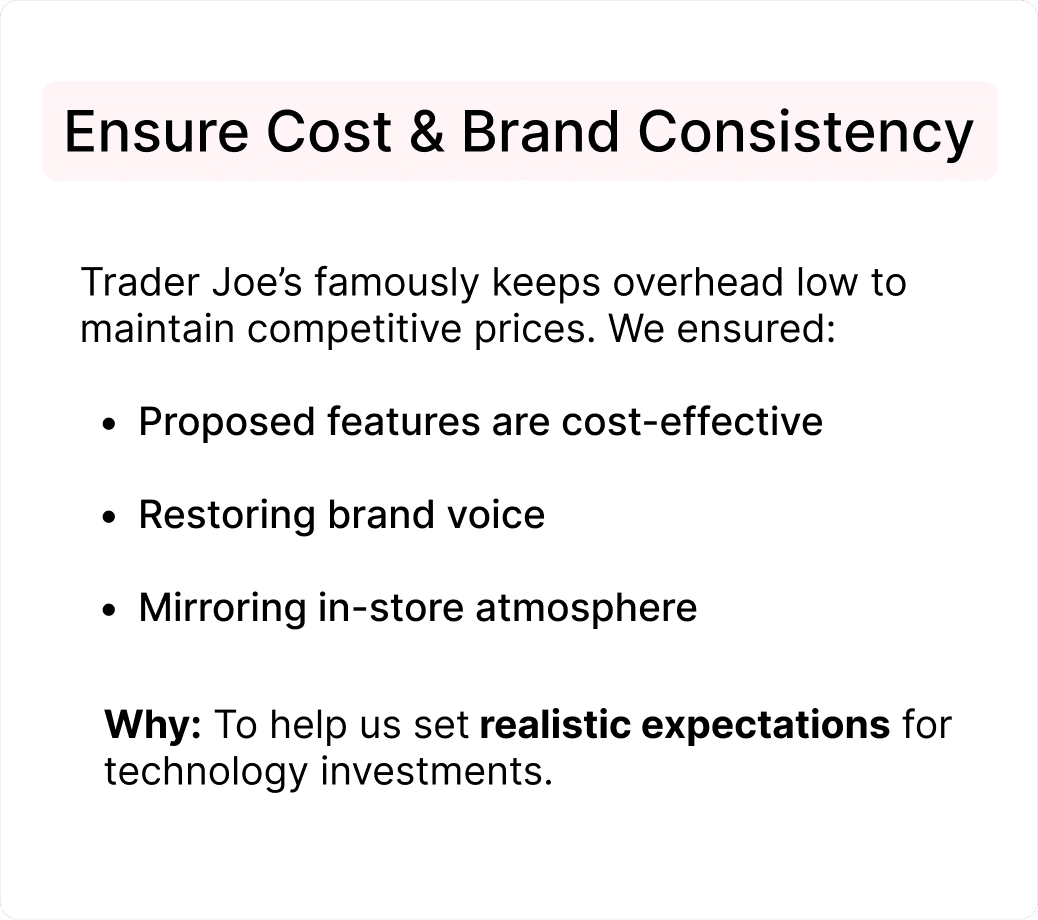 When we began this project, we recognized that Trader Joe's has a uniquely loyal community and a strong reputation for providing an engaging, in-store “treasure hunt” experience. We learned that their strategy hinges on: